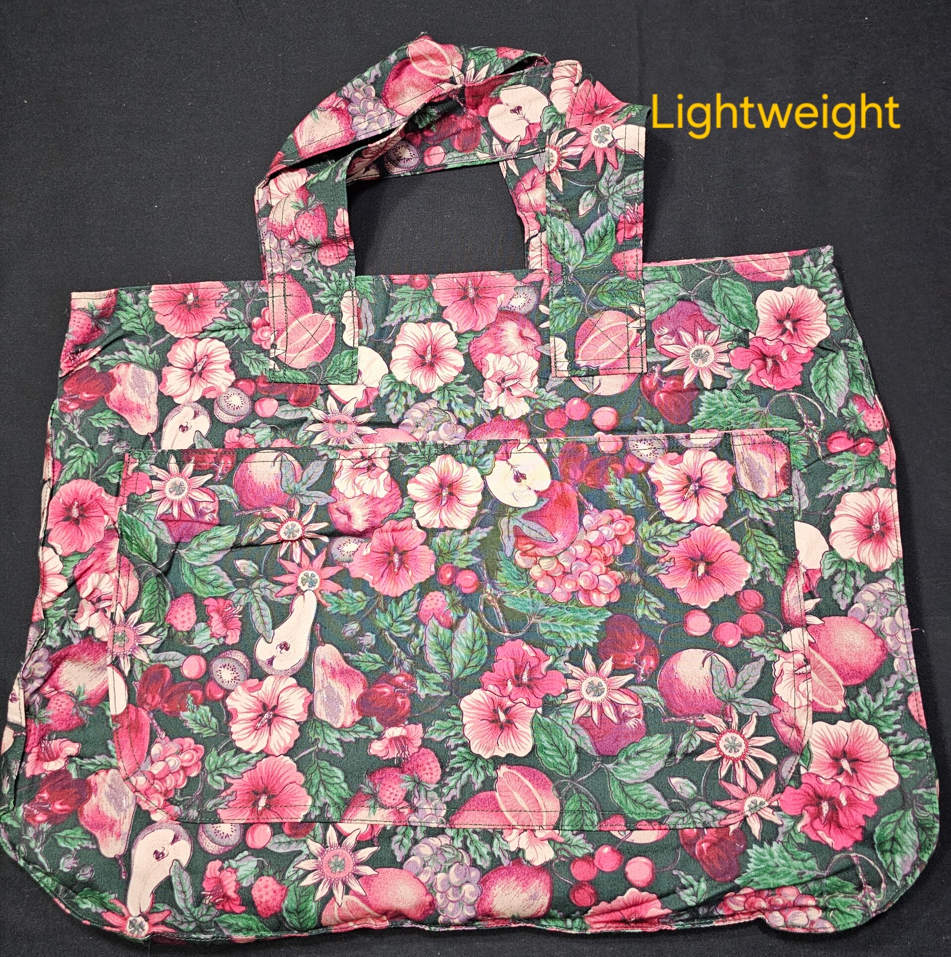 Measures 19" wide, 14" high, with a 4" gusset. Machine wash on cold. Hang, lay flat, or tumble dry.